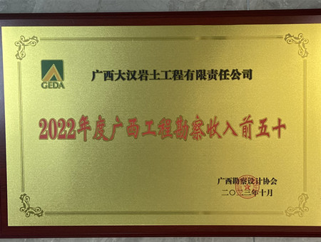 • 廣西大漢巖土工程有限責(zé)任公司榮獲“2022年度廣西工程勘察收入前五十”2023.11.07
